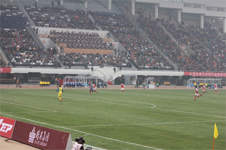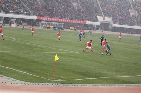 裕彤體育中心足球場(chǎng)長(zhǎng)110米、寬68米,中國(guó)足協(xié)領(lǐng)導(dǎo)認(rèn)定其具有國(guó)際標(biāo)準(zhǔn),有能力承辦任何級(jí)別的足球比賽。其它如田徑場(chǎng)、草坪、進(jìn)口塑膠跑道,主席臺(tái)、觀禮臺(tái)的照明、音響系統(tǒng)、彩色記分屏,亦屬世界一流。場(chǎng)中最?yuàn)Z目的是那座大型圖文顯示屏,面積240平方米,具有設(shè)時(shí)、文字、圖像等多功能,其質(zhì)量、亮度、可視角和程序設(shè)置等都達(dá)到了國(guó)際一流水平。北面三架寬大的車輛棧橋與環(huán)建筑外圍棧橋等等融為一體,各種車輛可直通場(chǎng)內(nèi),12礅螺旋式步行梯及一座大型步行梯入口、24座看臺(tái)出口使人流疏散合理、快捷、安全。